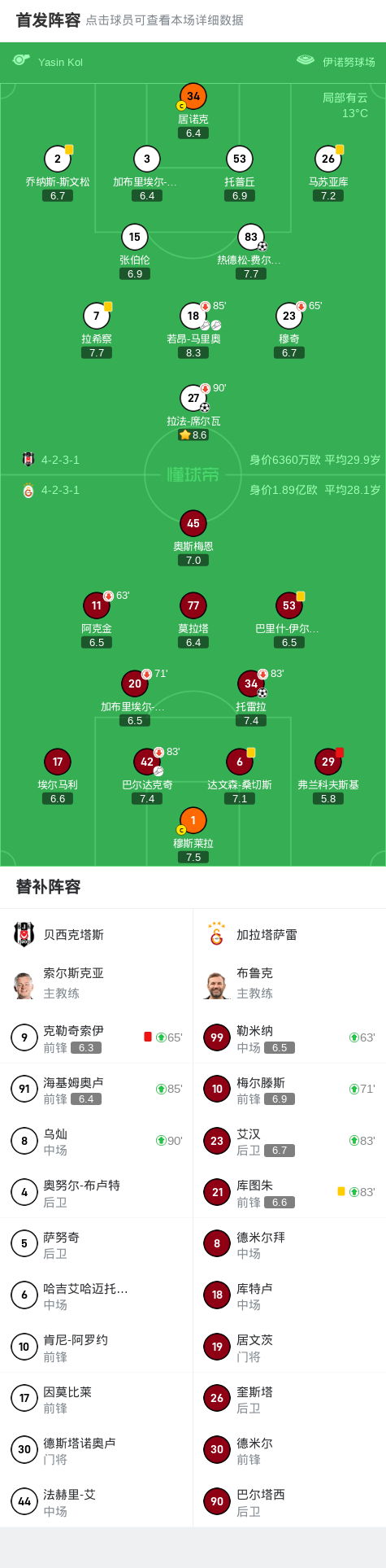 下半场补时第6分钟,贝西克塔斯球队克勒奇索伊吃到红牌。