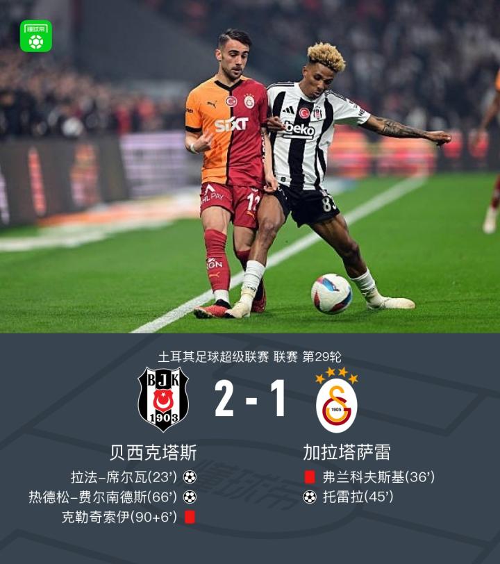 北京时间3月30日,土耳其足球超级联赛第29轮,贝西克塔斯主场迎战加拉塔萨雷。比赛中,贝西克塔斯由拉法-席尔瓦率先破门,为球队取得领先。随后,加拉塔萨雷遭遇不利局面,弗兰科夫斯基被出示红牌离场。尽管如此,托雷拉帮助加拉塔萨雷扳平比分。然而,热德松-费尔南德斯的进球再次让贝西克塔斯超出。补时阶段,贝西克塔斯的克勒奇索伊被红牌罚下。最终,贝西克塔斯以2-1战胜加拉塔萨雷。
