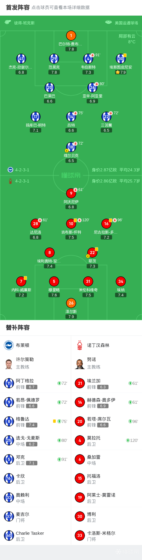 第120分钟,点球大战诺丁汉森林4-3布莱顿晋级,耶茨点射制胜
