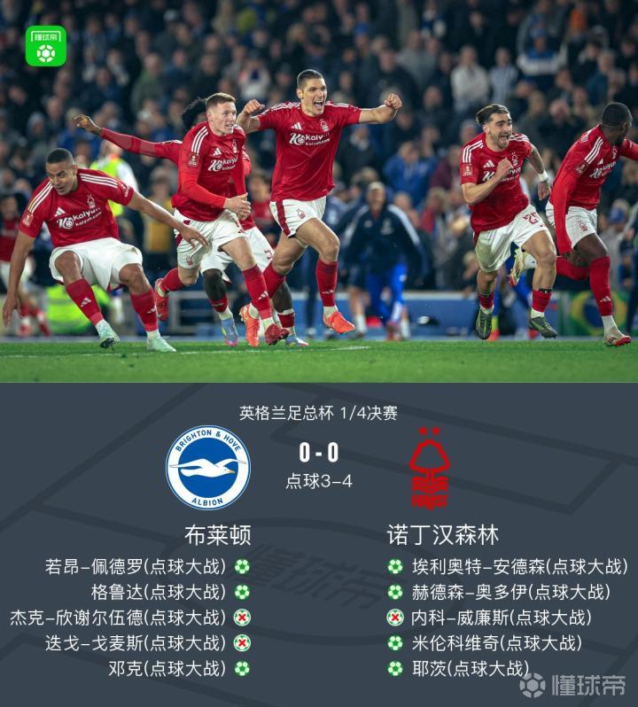 英格兰足总杯1/4决赛中,布莱顿与诺丁汉森林展开激烈较量。比赛常规时间两队0-0战成平局,双方点球大战中,杰克-欣谢尔伍德点射被门将扑出,内科-威廉斯也将点球罚丢,随后迭戈-戈麦斯主罚再次被泽尔斯扑出,最终由耶茨打入制胜一球帮助诺丁汉森林锁定胜利,全场战罢,诺丁汉森林4-3布莱顿成功晋级。
