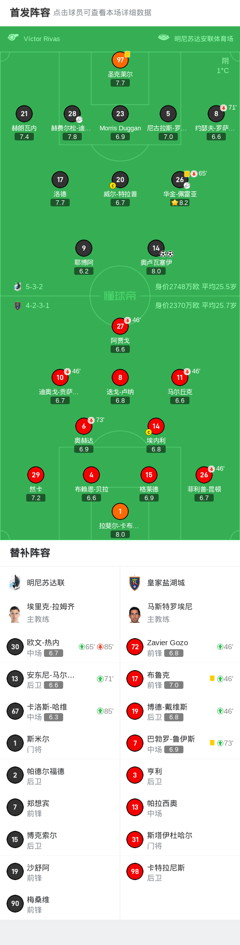 第30分钟,明尼苏达联球员赫费尔松-迪亚斯助攻奥卢瓦塞伊打入一球。