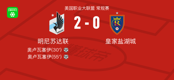 明尼苏达联2-0皇家盐湖城,奥卢瓦塞伊独中两元