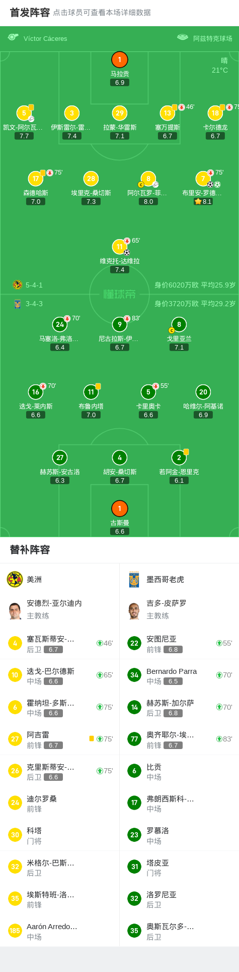 第32分钟,美洲球员阿尔瓦罗-菲达尔戈助攻布里安-罗德里格斯打入一球。