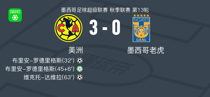 美洲3-0大胜墨西哥老虎,布里安-罗德里格斯梅开二度,维克托-达维拉建功