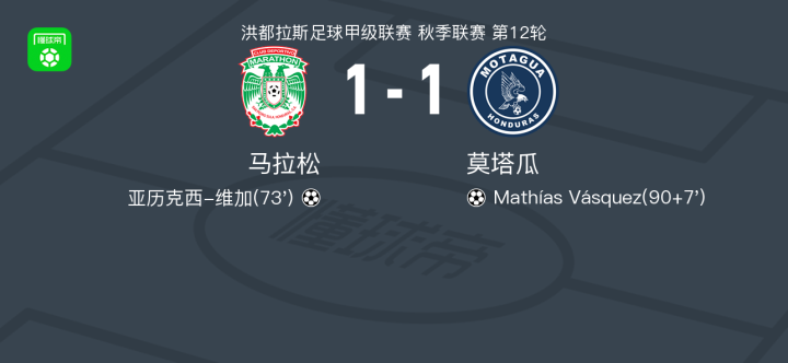 北京时间3月30日,洪都拉斯足球甲级联赛秋季联赛第12轮,马拉松主场迎战莫塔瓜。比赛中,马拉松由亚历克西-维加取得进球,为球队打破僵局。莫塔瓜则凭借Mathías Vásquez的进球扳平比分。最终,双方以1-1的比分握手言和。