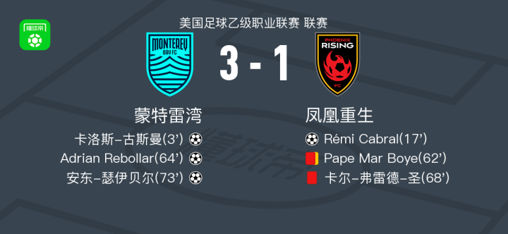 北京时间3月30日美国足球乙级职业联赛,蒙特雷湾主场迎战凤凰重生。比赛开始后,蒙特雷湾迅速取得领先,卡洛斯-古斯曼接到队友助攻成功破门。随后,凤凰重生展开反击,Rémi Cabral在一次进攻中抓住机会将比分扳平。比赛进入下半场,场上局势发生变化,凤凰重生接连有两名球员因犯规被罚下场。人数占优的蒙特雷湾趁势发起猛攻,Adrian Rebollar和安东-瑟伊贝尔先后建功,帮助球队锁定胜局。最终全场比赛结束,蒙特雷湾以3-1战胜凤凰重生。
