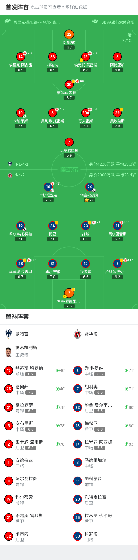 蒂华纳2-1蒙特雷,希尔韦托-莫拉、何塞-苏尼加破门