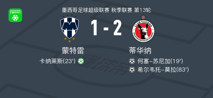 在墨西哥足球超级联赛秋季联赛第13轮的较量中,蒙特雷主场迎战蒂华纳。比赛中,蒂华纳由何塞-苏尼加率先打破僵局,随后蒙特雷依靠卡纳莱斯的点球扳平比分。比赛尾声阶段,希尔韦托-莫拉为蒂华纳再入一球锁定胜局。最终,蒙特雷以1-2不敌蒂华纳。