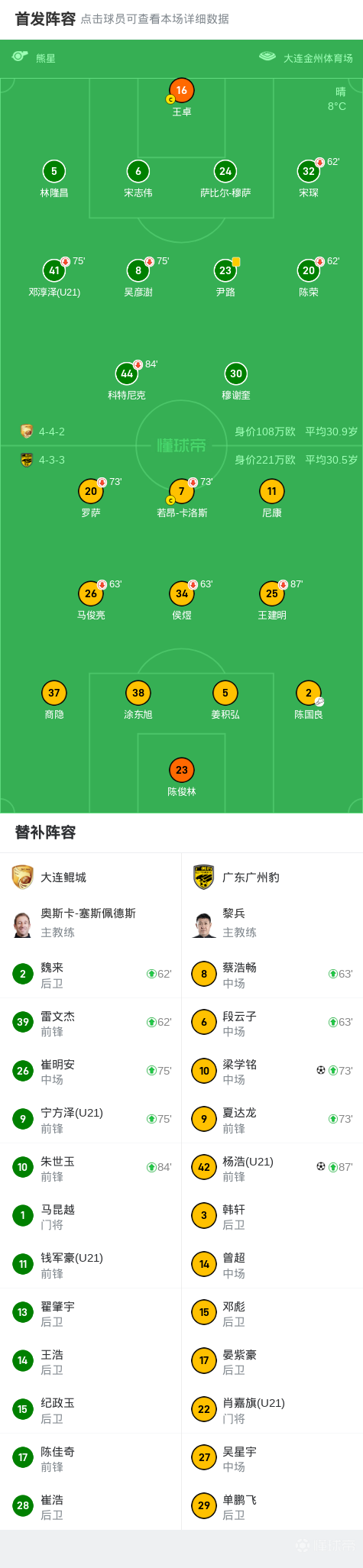 北京时间3月30日,中国足球甲级联赛第2轮,大连鲲城主场迎战广东广州豹。比赛中,广东广州豹凭借梁学铭和杨浩的进球,最终2-0客场战胜大连鲲城。