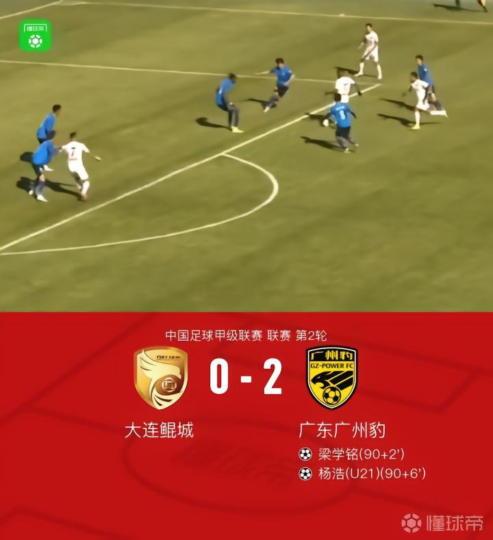广东广州豹2-0大连鲲城,梁学铭破门,杨浩锁定胜局