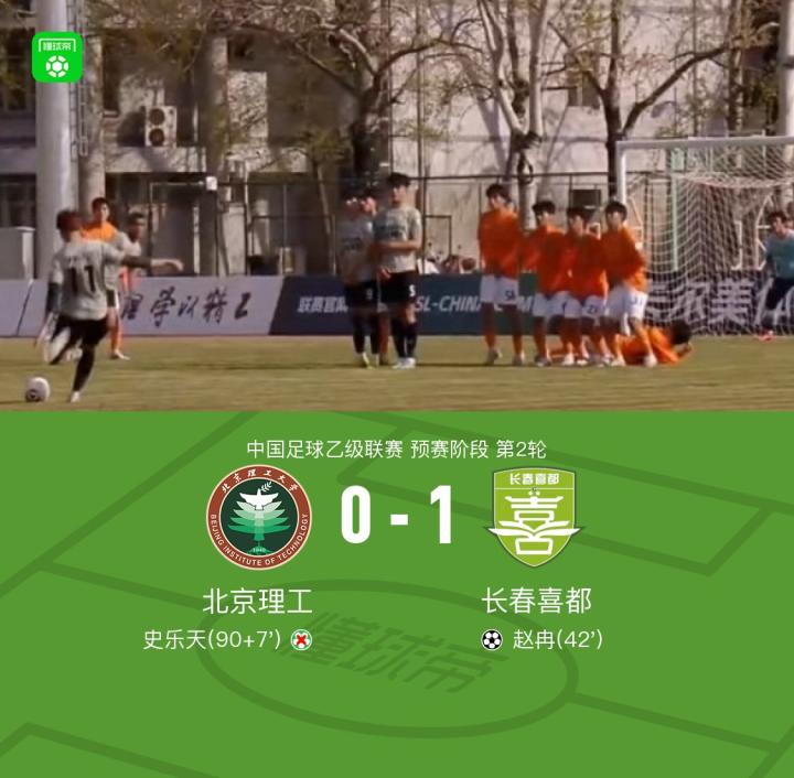 北京时间3月30日,中国足球乙级联赛预赛阶段第2轮,北京理工主场迎战长春喜都。比赛中,长春喜都凭借赵冉的进球取得领先。下半场补时阶段,北京理工获得点球机会,但史乐天未能将球罚进。最终,北京理工0-1不敌长春喜都。