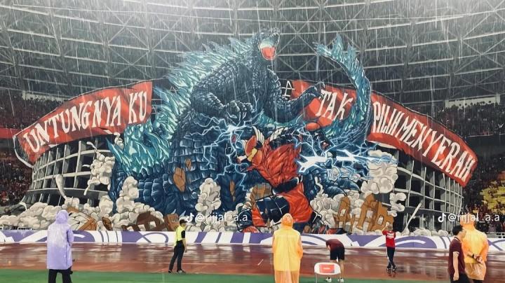 这并非印尼球迷第一次展现震撼的tifo。在2024年11月印尼主场对阵日本的比赛中,他们就曾制作了一幅巨大的tifo,主题是“加鲁达痛击哥斯拉”。 不过该场比赛印尼队最终告负。