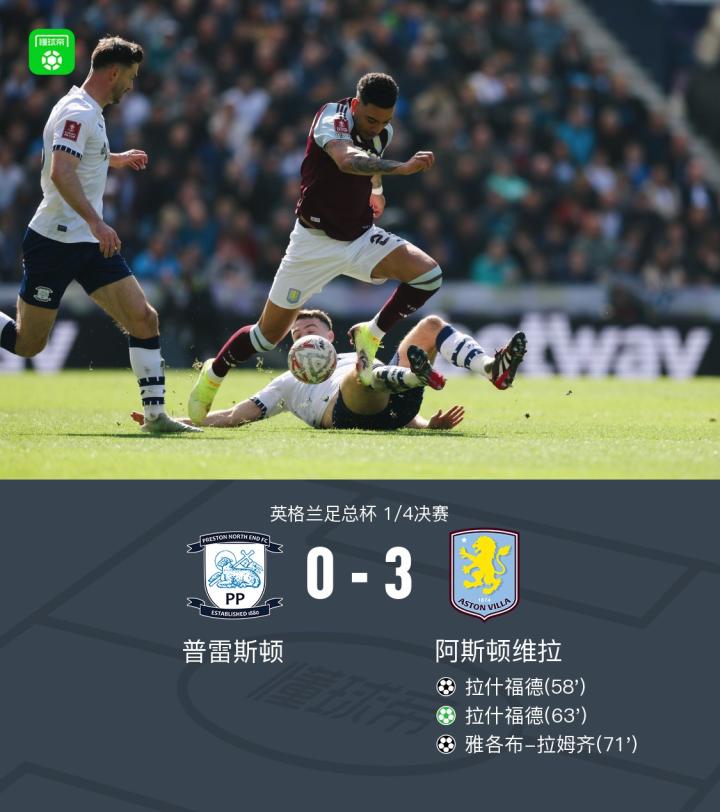 北京时间3月30日,英格兰足总杯1/4决赛,普雷斯顿对阵阿斯顿维拉。比赛中,拉什福德五分钟连进两球,雅各布-拉姆齐抽射建功。最终,阿斯顿维拉客场3-0普雷斯顿晋级四强。
