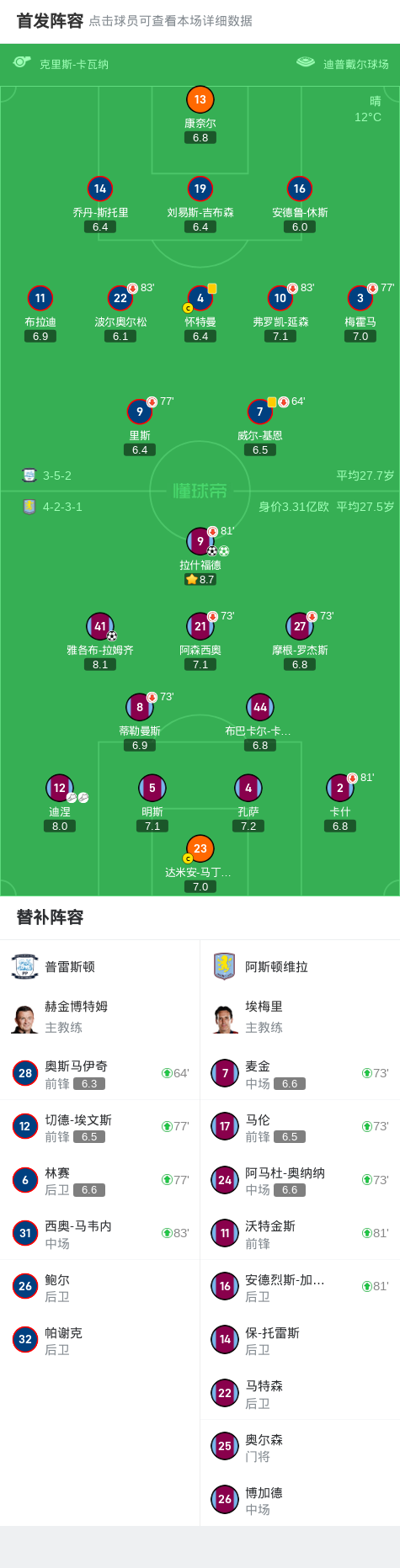 足总杯维拉客场3-0普雷斯顿晋级,拉什福德双响,拉姆齐建功