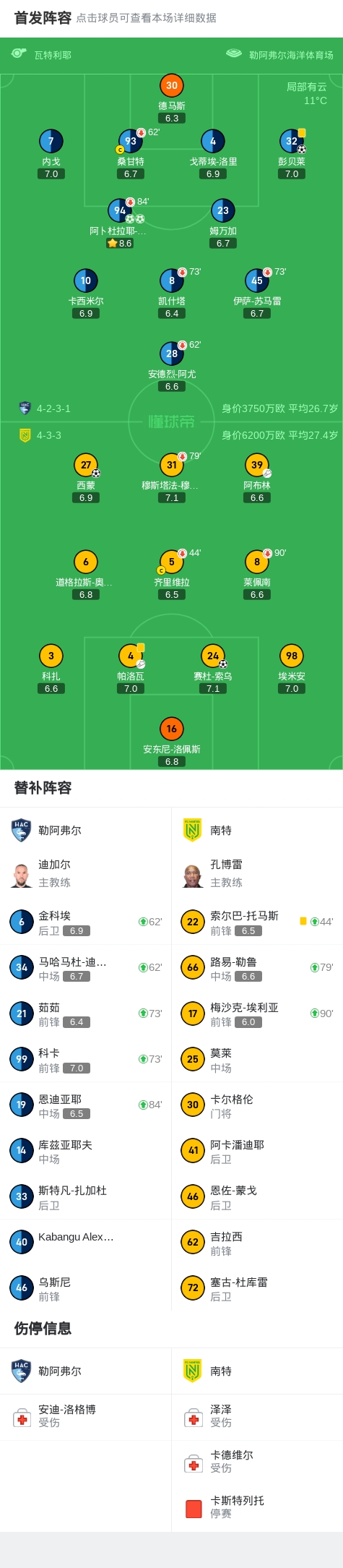 勒阿弗尔3-2南特,阿卜杜拉耶-图雷点射双响,彭贝莱绝杀