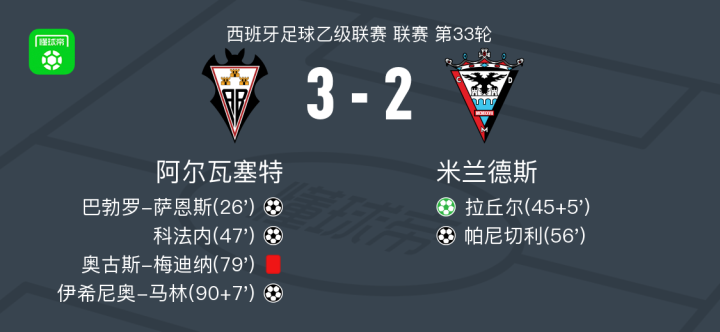 北京时间3月31日,西班牙足球乙级联赛第33轮,阿尔瓦塞特主场迎战米兰德斯。比赛中,阿尔瓦塞特由巴勃罗-萨恩斯率先破门,随后科法内在队友助攻下再下一城。米兰德斯方面,拉丘尔通过点球机会扳回一分,之后帕尼切利接拉丘尔助攻将比分差距缩小。尽管阿尔瓦塞特在比赛尾声阶段由伊希尼奥-马林在巴勃罗-萨恩斯的助攻下打入一球,但因球队一名队员被红牌罚下,比赛局势一度紧张。最终,阿尔瓦塞特以3-2战胜米兰德斯。