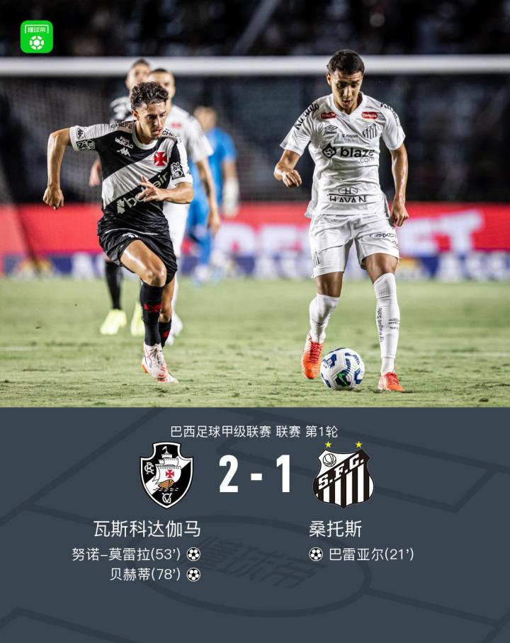 北京时间3月31日,巴西足球甲级联赛第1轮,瓦斯科达伽马主场迎战桑托斯。比赛中,桑托斯由巴雷亚尔率先打破僵局,随后瓦斯科达伽马展开反击,努诺-莫雷拉接到贝赫蒂的助攻将比分扳平,之后贝赫蒂又在帕耶的助攻下完成反超。最终,瓦斯科达伽马以2-1战胜桑托斯。