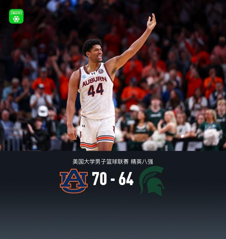 下半场比赛,奥本大学约翰·布鲁姆拿下8分,密西根州立大学贾登·阿金斯拿下13分,最终奥本大学70-64战胜密西根州立大学。