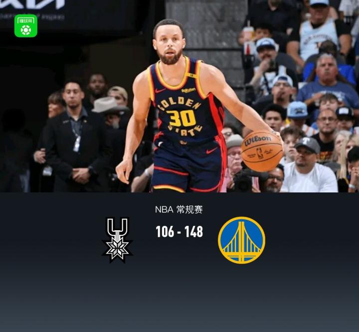 勇士148-106马刺重夺西部第6,库里13+6,波杰姆斯基27+6+5