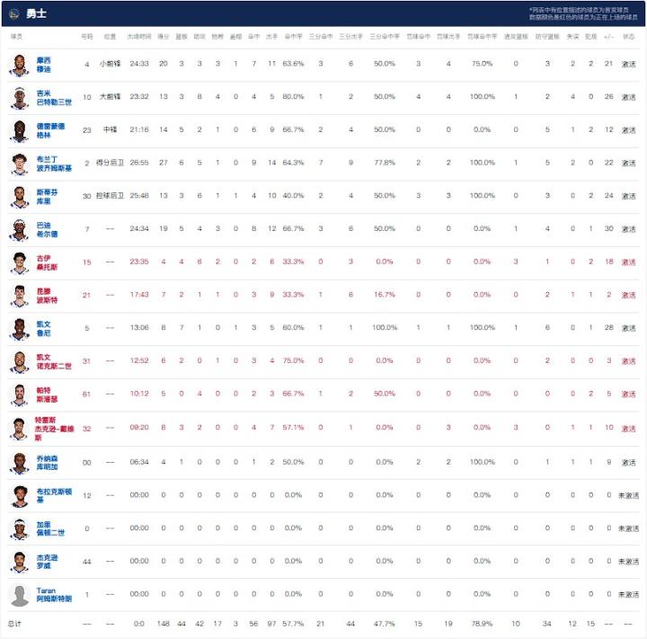 金州勇士波杰姆斯基27分6板5助1断,穆迪20分3板3助3断1帽,希尔德19分5板4助3断。