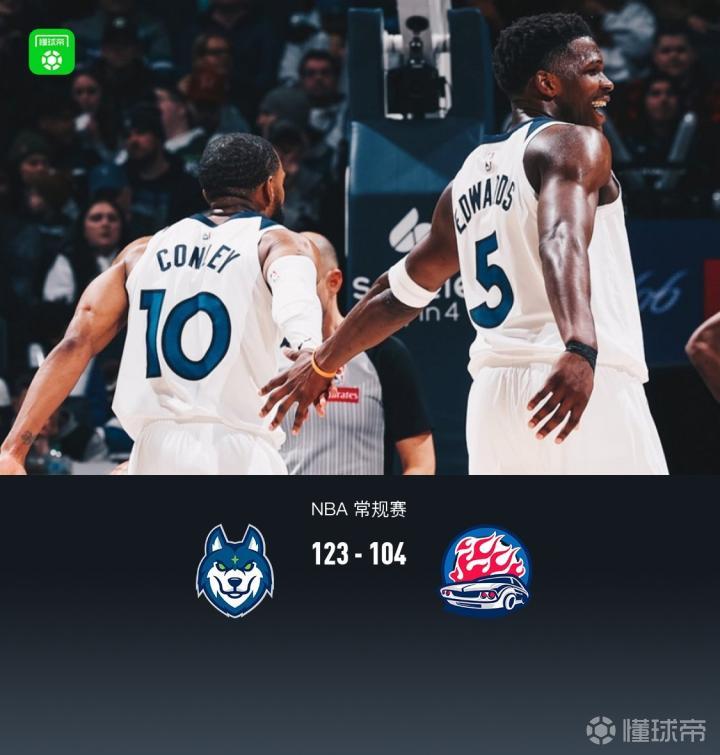 第四节森林狼康利拿下8分,活塞奥萨尔-汤普森拿下8分,最终森林狼123-104战胜活塞