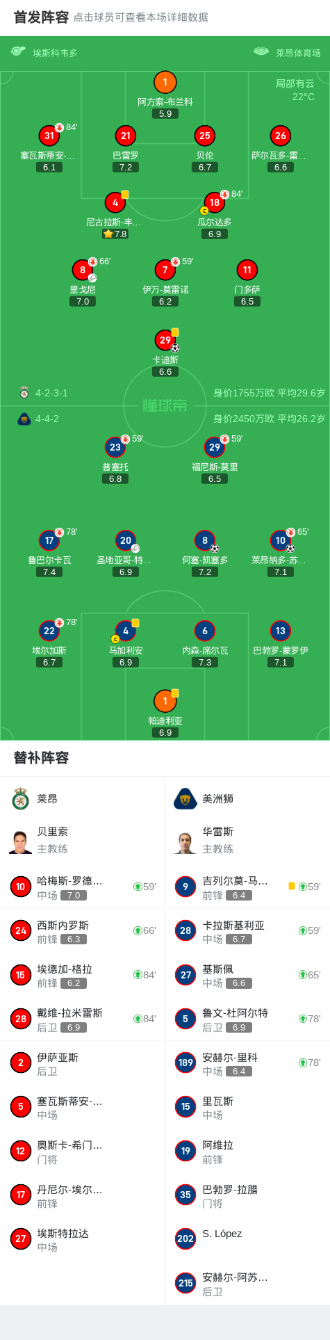 北京时间3月31日,墨西哥足球超级联赛秋季联赛第13轮,莱昂主场迎战美洲狮。比赛中,莱昂凭借卡迪斯的进球取得领先。美洲狮方面,莱昂纳多-苏亚雷斯为球队扳平比分,随后何塞-凯塞多打入制胜一球。最终,莱昂1-2不敌美洲狮。