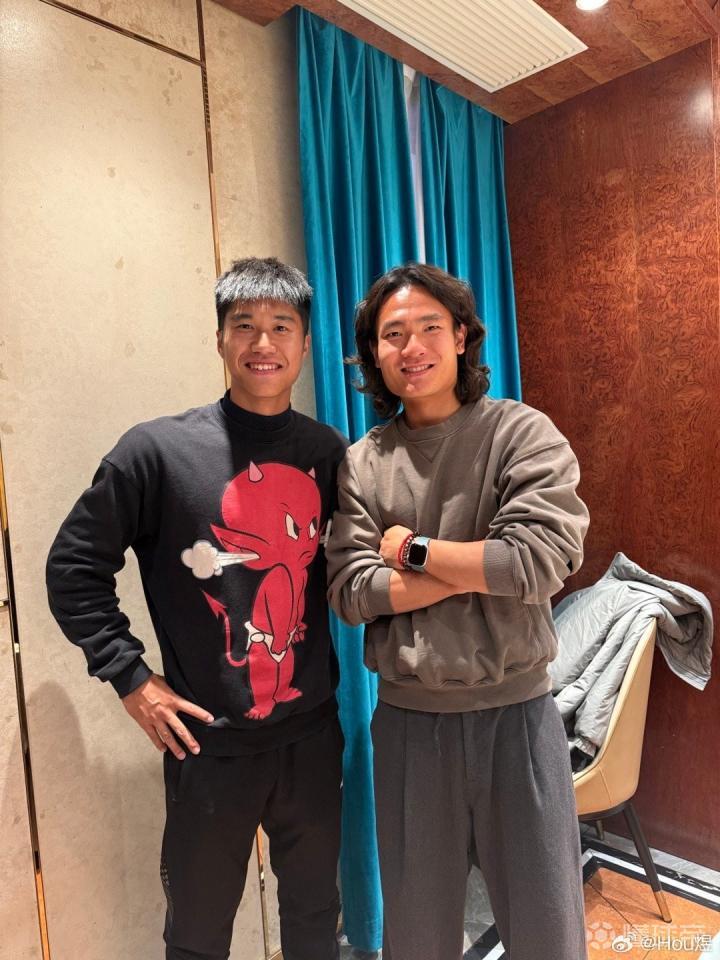 3月30日,前广州队球员侯煜与他的老队友廖锦涛在大连相聚,两人合照纪念这一刻。