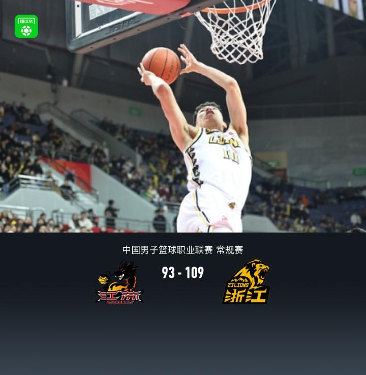第四节江苏阿奇-古德温拿下10分,广厦王欣瑞拿下6分,最终江苏93-109不敌广厦
