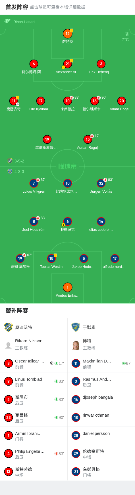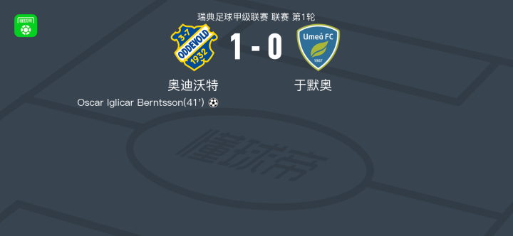 北京时间4月1日,瑞典足球甲级联赛第1轮,奥迪沃特主场迎战于默奥。比赛中,奥迪沃特通过克雷齐奇的助攻,由Oscar Iglicar Berntsson完成进球,帮助球队取得领先。最终,奥迪沃特以1-0战胜于默奥,全取三分。