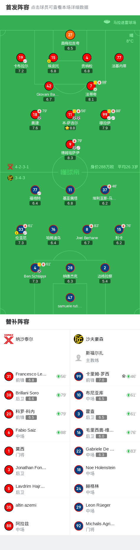 第24分钟,纳沙泰尔球员穆拉伊助攻本-萨吉尔打入一球。