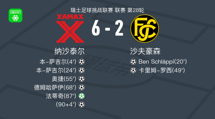 瑞士足球挑战联赛第28轮,纳沙泰尔主场迎战沙夫豪森。比赛开始后,纳沙泰尔迅速取得领先,本-萨吉尔在队友助攻下率先破门。随后,沙夫豪森由Ben Schläppi扳平比分。不久之后,本-萨吉尔再次建功,帮助纳沙泰尔重新取得领先。下半场,沙夫豪森通过卡里姆-罗西的进球将比分差距缩小,但纳沙泰尔随即展开攻势,奥捷和德姆哈萨伊相继进球扩大优势。此后,法蒂奇点球命中进一步巩固领先位置。补时阶段,纳沙泰尔再入一球锁定胜局。最终,纳沙泰尔以6-2战胜沙夫豪森。