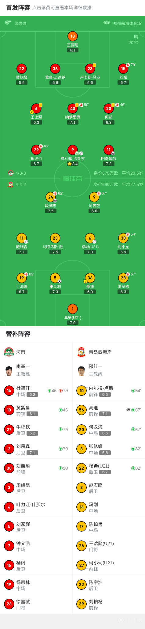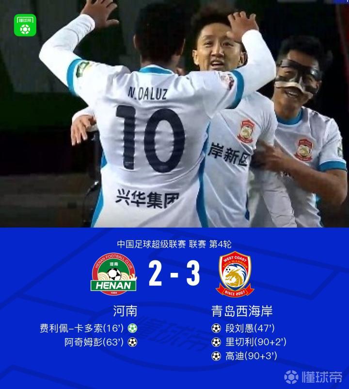 北京时间4月1日,中国足球超级联赛第4轮,河南主场迎战青岛西海岸。上半场卡多索倒钩被李昊没收,随后卡多索点射破门,迈达纳头球造险,下半场阿奇姆彭段刘愚推射扳平比分,徐彬失空门,阿奇姆彭头球建功,里切利补时头球破门,高迪绝杀。最终,河南以2-3不敌青岛西海岸。