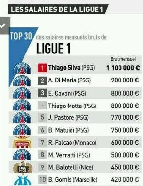 (图)《队报》2017年初公布的法甲月薪榜