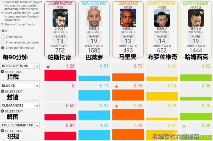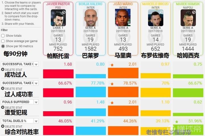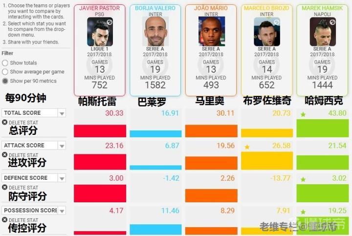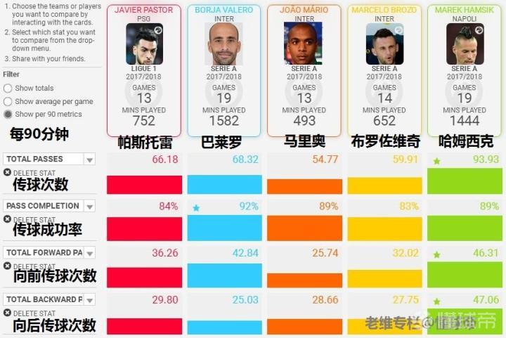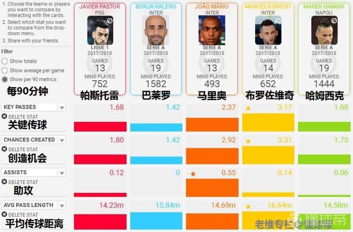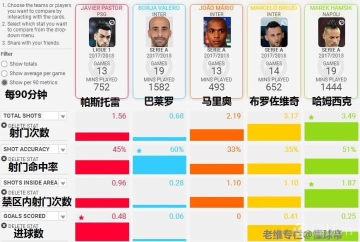 下面我们再来通过数据对比,分析一下帕斯托雷的具体表现。选取本赛季各自在联赛中的数据,以每90分钟平均数据为标准,对比对象为国际米兰本赛季打过前腰的巴莱罗、布罗佐维奇、马里奥以及意甲最优秀的攻击中场哈姆西克。