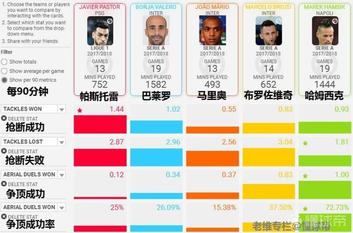 没有想到吧,在尝试抢断以及成功抢断次数上,帕斯托雷居然都排在第一,身体对抗的积极性与成功率都超过了大家印象中的硬汉哈姆西克,非常颠覆的数据。但是在争顶方面,帕斯托雷又暴露了本性,空有1米87的身高,争顶能力不光不如布罗佐维奇,甚至还不如巴莱罗。也就是说,他基本不会去争顶高球。
