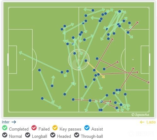 从评分上看,这场几乎是巴莱罗的巅峰表现了,传球58次,成功率85%,但是基本都是在两条边路策应为主,作为前腰,在中路禁区前沿不仅没有直接的向前成功传球,而且也没能横向串联起前场,使得两条边路各自为战。这也是目前国际米兰在进攻中的最大问题。