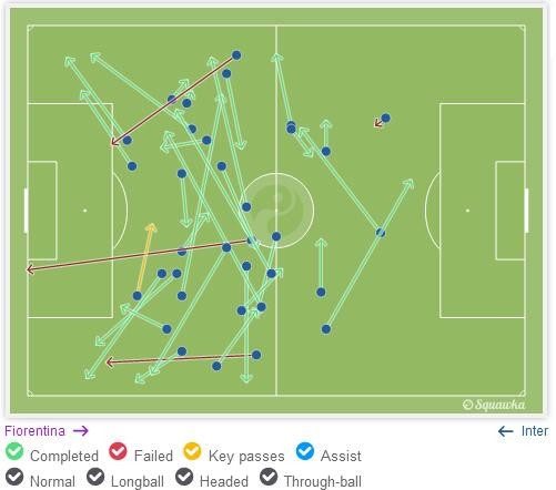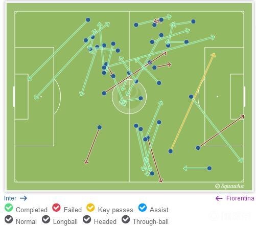 传球次数方面,哈姆西克高居榜首,由于那不勒斯的战术,意甲传球次数榜前几名都被那不勒斯球员包揽,帕斯托雷排名第二,高于国际米兰三人;但是在传球成功率方面,帕斯托雷仅有84%,仅高于以传球失误多出名的布罗佐维奇,这就是他传控方面评分低的原因,当然这主要是因为他喜欢传一些出乎意料的妙传,对手想不到,队友也想不到。在传球方向上,帕斯托雷的向前传球比例为55%,巴莱罗为62.7%,马里奥为47%,布罗佐维奇为53.4%,哈姆西克为49.3%,抛开巴莱罗,帕斯托雷的向前传球最多,布罗佐维奇第二,这也是他们俩传球成功率偏低的原因,但大家印象中只会分边和回传的巴莱罗为什么会有这么高的向前传球比例呢?我看了一下刚刚结束的这场国际米兰战平佛罗伦萨的比赛中巴莱罗的传球,找到了答案: