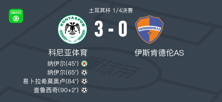 第65分钟,科尼亚体育球员恩道助攻纳伊尔打入一球。