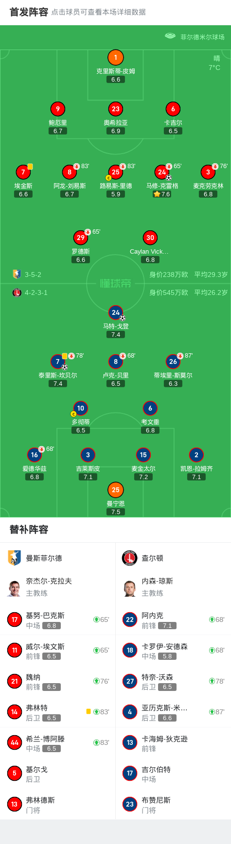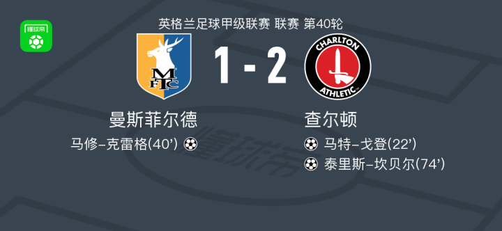 北京时间4月2日英格兰足球甲级联赛 联赛 第40轮,曼斯菲尔德主场对阵查尔顿。曼斯菲尔德马修-克雷格破门。查尔顿马特-戈登破门,泰里斯-坎贝尔破门。最终比分曼斯菲尔德 1-2 查尔顿。