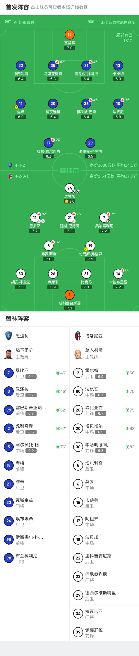 恩波利0-3博洛尼亚,达林加双响,奥尔索利尼破门