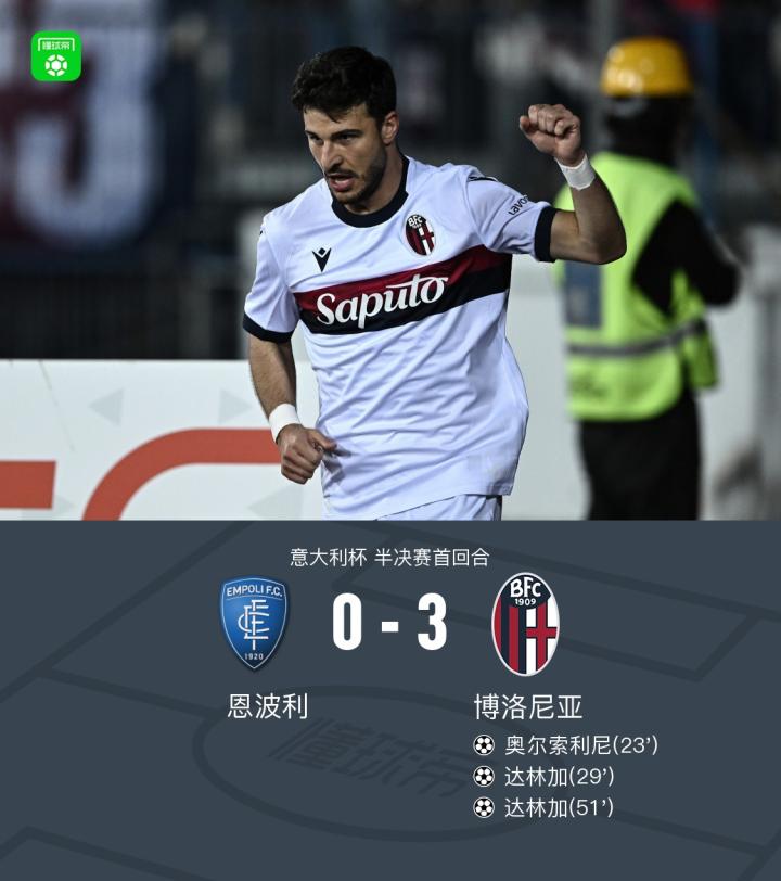 意大利杯半决赛首回合,恩波利对阵博洛尼亚。比赛中,博洛尼亚展现出强大攻势,奥尔索利尼成功打入一球为球队取得领先。随后,达林加在比赛中两度建功,完成梅开二度,帮助博洛尼亚稳固优势。最终,恩波利以0-3的比分不敌博洛尼亚。