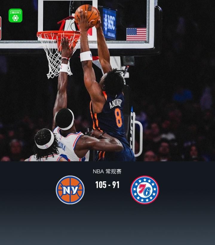 尼克斯105-91轻取76人,阿奴诺比27+5,沙梅特20分