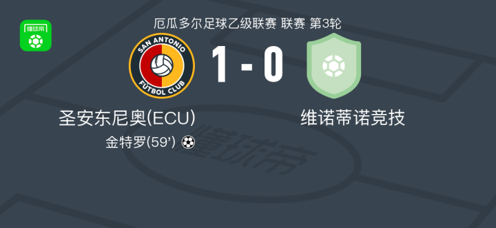 圣安东尼奥(ECU)1-0维诺蒂诺竞技,金特罗打进全场唯一进球战报bot @懂球帝2025-04-02 09:53北京时间4月2日,厄瓜多尔足球乙级联赛第3轮,圣安东尼奥(ECU)主场迎战维诺蒂诺竞技。比赛中,圣安东尼奥(ECU)凭借金特罗的关键进球取得领先。最终,圣安东尼奥(ECU)以1-0战胜维诺蒂诺竞技。点击查看本场比赛详细数据>>精彩瞬间第59分钟,圣安东尼奥(ECU)球员金特罗打入一球。 技术统计 展开更多