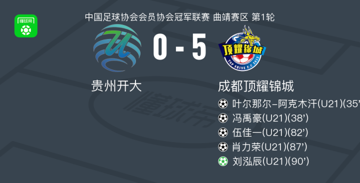 成都顶耀锦城5-0血洗贵州开大,刘泓辰点射破门,肖力荣建功