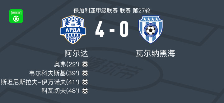 阿尔达4-0大胜瓦尔纳黑海,科瓦切夫1传1射,斯坦尼斯拉夫-伊万诺夫传射
