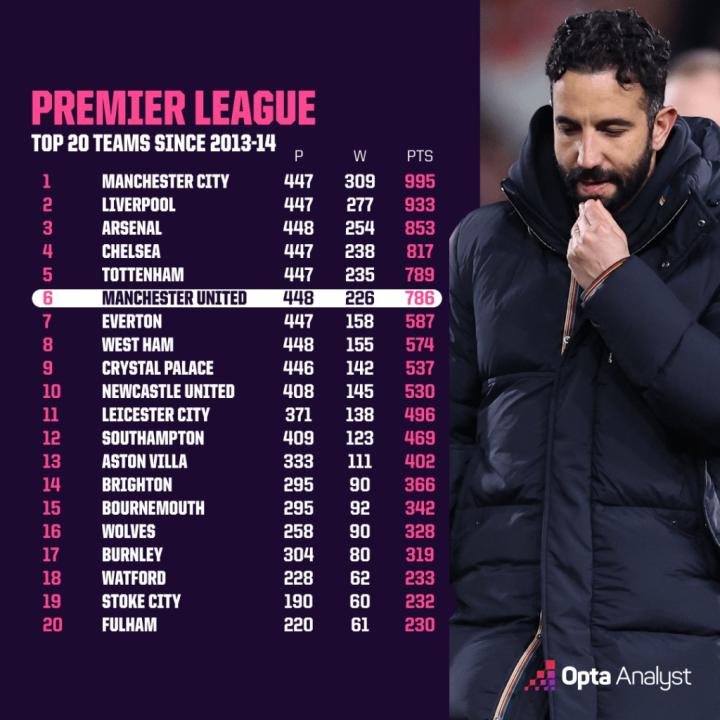 据Opta统计,自弗格森爵士在2013年退休以来,曼联在英超拿到786分,同期排名第六。