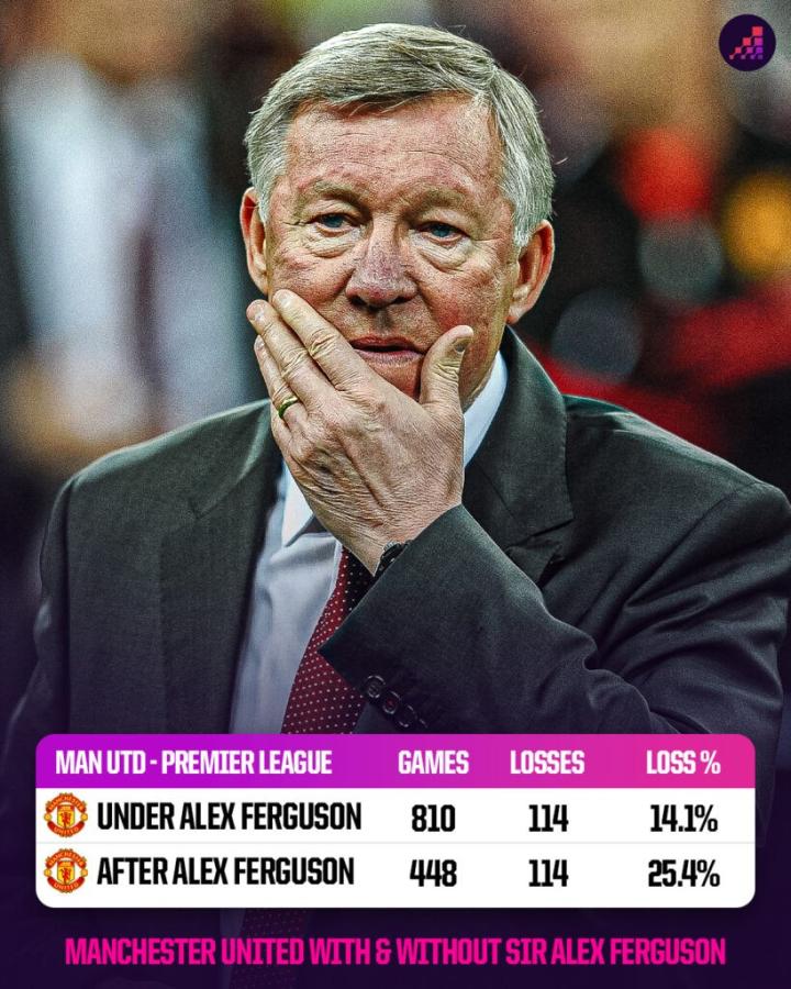自弗格森退休以来,曼联在10位不同教练的带领下,在448场英超比赛输掉了114场,与弗格森执教时期810场英超的输球场次持平。