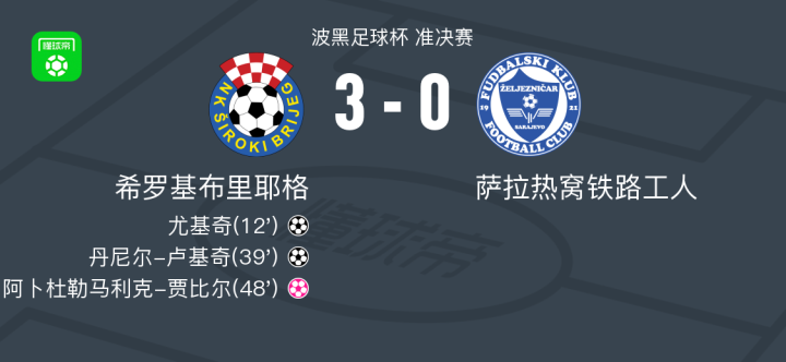 北京时间4月3日,波黑足球杯准决赛,希罗基布里耶格与萨拉热窝铁路工人展开较量。比赛中,尤基奇成功取得进球为球队打开局面,随后丹尼尔-卢基奇再下一城扩大领先优势。此外,阿卜杜勒马利克-贾比尔不慎自摆乌龙,进一步拉大了比分差距。最终,希罗基布里耶格以3-0战胜萨拉热窝铁路工人,顺利晋级。