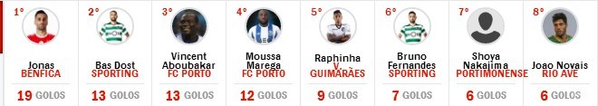 在里斯本德比大战中,若纳斯打进1粒点球,并以19球继续领跑射手榜。本轮有1球入账的阿布巴卡尔,已追平排名第2的多斯特。马雷加、拉菲尼亚和布鲁诺-费尔南德斯分列第3至第5位。