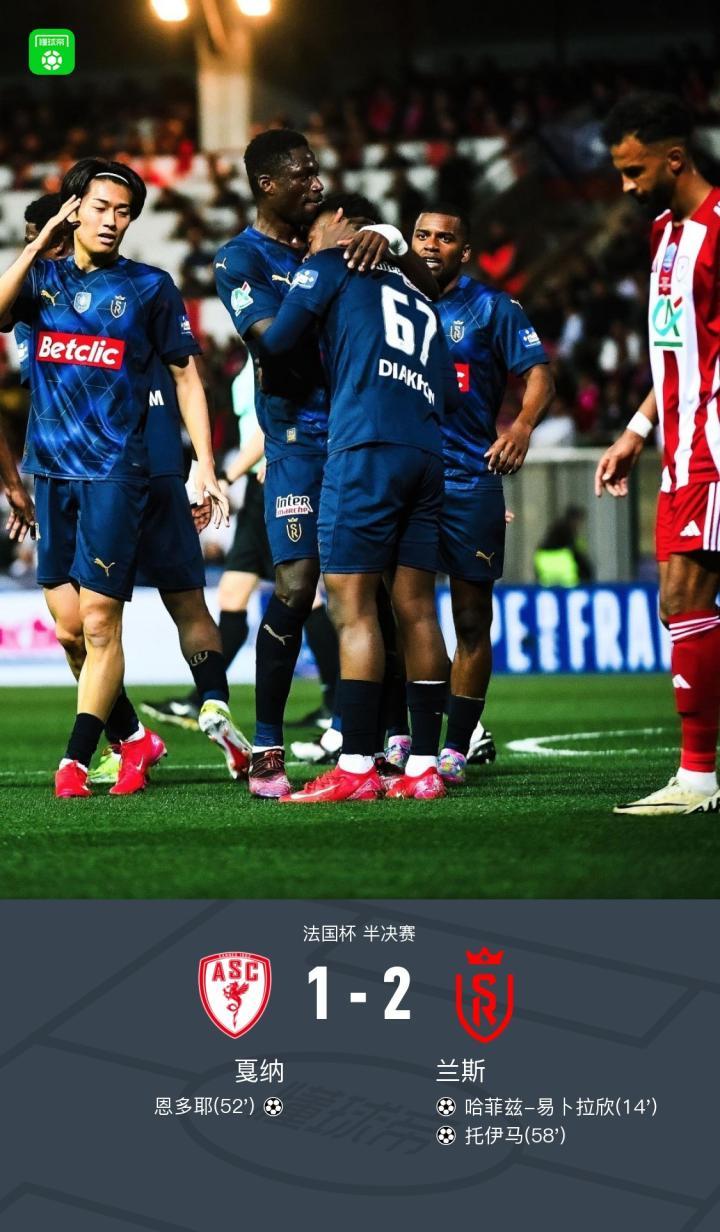 北京时间4月3日法国杯 半决赛,戛纳对阵兰斯。戛纳恩多耶破门。兰斯哈菲兹-易卜拉欣破门,托伊马破门。最终比分戛纳 1-2 兰斯。